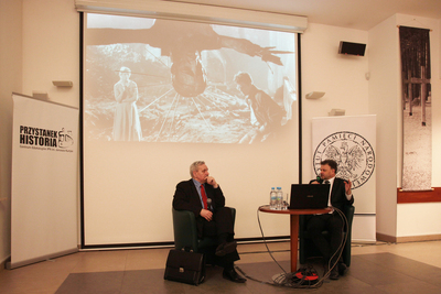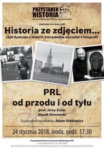 W środę 24 stycznia w Centrum Edukacyjnym IPN im. Janusza Kurtyki Przystanek Historia odbyło się kolejne spotkanie z cyklu „Historia ze zdjęciem”, zatytułowane „PRL od przodu i od tyłu”. O czarnym i białym wizerunku PRL dyskutowali goście Adama Hlebowicza: prof. Jerzy Eisler (dyrektor Oddziału IPN w Warszawie) oraz Marek Stremecki (dziennikarz radiowej Trójki, rzecznik prasowy Muzeum Historii Polski).