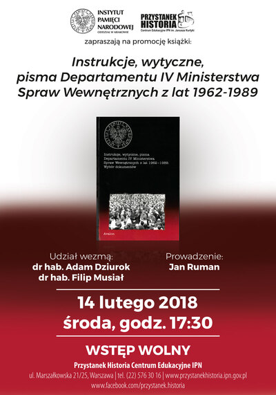 W Centrum Edukacyjnym „Przystanek Historia” IPN w Warszawie (ul. Marszałkowska 21/25) odbędzie się 14 lutego (godz. 17.30) promocja książki „Instrukcje, wytyczne, pisma Departamentu IV Ministerstwa Spraw Wewnętrznych z lat 1962-1989”, opublikowanej przez krakowski oddział IPN. Rozmowę z dr. hab. Filipem Musiałem i dr. Adamem Dziurokiem, redaktorami tomu, poprowadzi Jan Ruman, redaktor naczelny „Biuletynu IPN”.