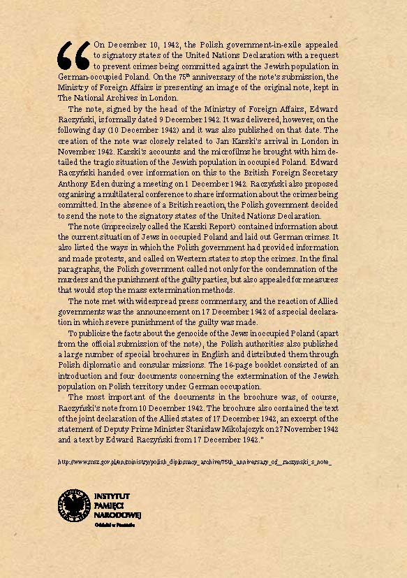 10 grudnia 1942 r. rząd RP na uchodźstwie zwrócił się do państw sygnatariuszy Deklaracji Narodów Zjednoczonych z apelem w sprawie zapobieżenia zbrodniom dokonywanym na ludności żydowskiej w okupowanej przez Niemców Polsce. Prezentowana nota, sygnowana przez ówczesnego kierownika MSZ Edwarda Raczyńskiego, nosi formalnie datę 9 grudnia 1942 r. Jej wręczanie nastąpiło jednak kolejnego dnia (10 grudnia 1942 r.) i z taką też datą została ona następnie opublikowana.