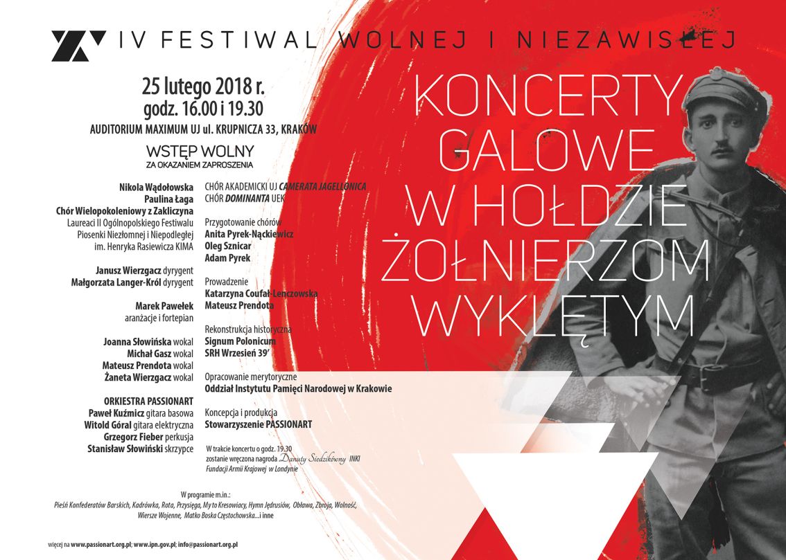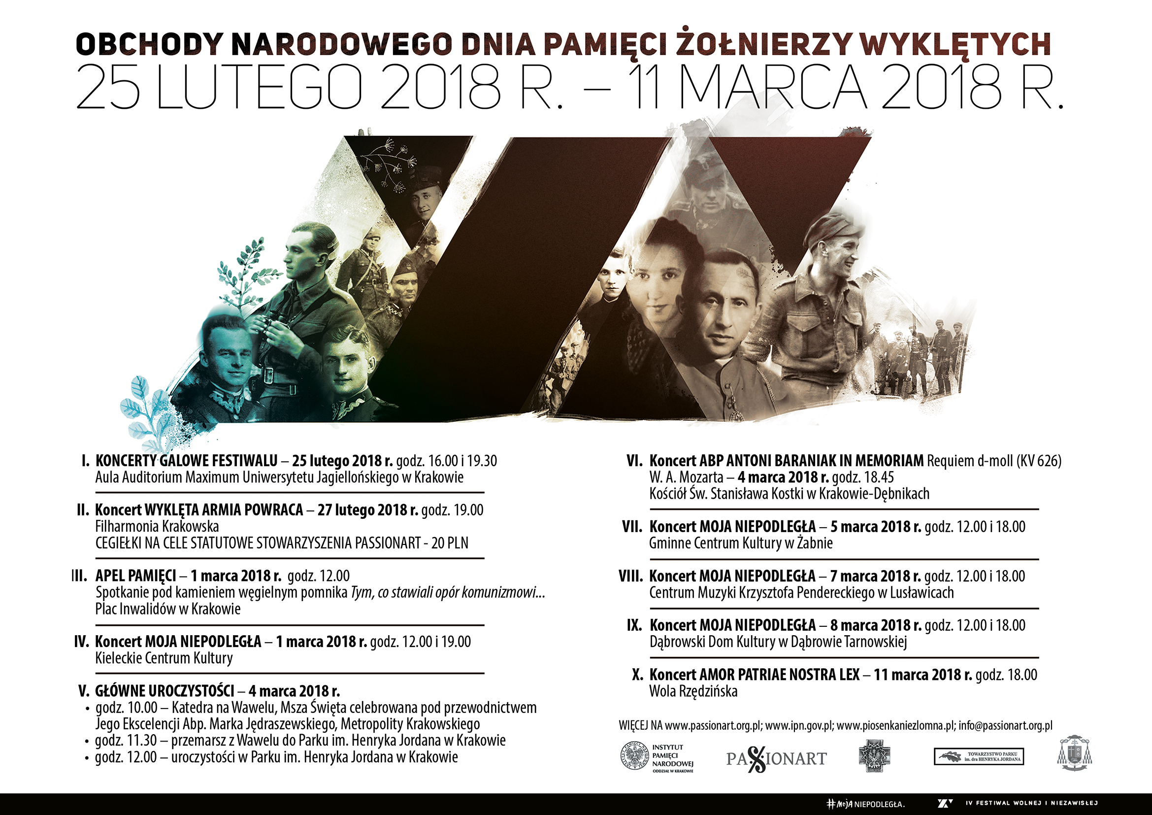 27 lutego 2018 r. w Filharmonii Krakowskiej (godz. 19) odbędzie się spektakl muzyczny „Wyklęta armia powraca” z udziałem bardów: Andrzeja Kołakowskiego, Leszka Czajkowskiego i Pawła Piekarczyka, a także pianisty Andrzeja Perkmana oraz sopranistki Katarzyny Guran i Męskiego Zespołu Wokalnego Filharmoników Krakowskich pod kierunkiem Marcina Wróbla. W programie koncertu pod honorowym patronatem Oddziału IPN w Krakowie znajdą się utwory z płyt „Powstańcza Armia Powraca”, „Oskarżeni o Wierność”, „Requiem dla poległych” oraz pieśni Żołnierzy Wyklętych. Wejściówki (20 zł) w formie cegiełek na cele statutowe Stowarzyszenia Passionart - do nabycia w Filharmonii Krakowskiej w godzinach otwarcia kas.
