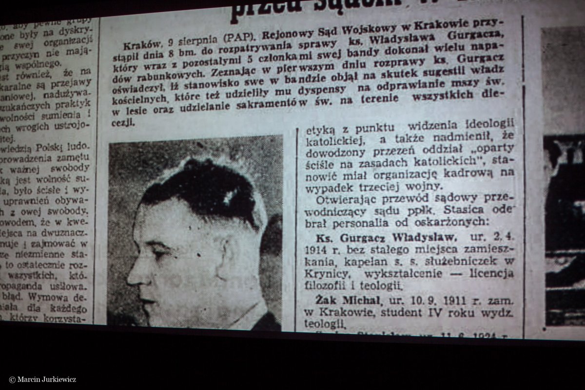 2 marca 2018 w kinie Atlantic w Warszawie odbył się pokaz pełnometrażowego fabularyzowanego dokumentu o księdzu jezuicie Władysławie Gurgaczu, kapelanie oddziału „Żandarmerii” Polskiej Podziemnej Armii Niepodległościowej, rozstrzelanym 14 września 1949 r. na mocy wyroku komunistycznego sądu. Prezydent RP Andrzej Duda objął Patronat Narodowy nad filmem. Dokument wręczył reżyserowi prezes Instytutu Pamięci Narodowej Jarosław Szarek i szef Urzędu do Spraw Kombatantów i Osób Represjonowanych Jan Józef Kasprzyk. Przedsięwzięciu patronuje też Oddział IPN w Krakowie. Jego pracownicy udzielali realizatorom obrazu wsparcia merytorycznego. Zdjęcia do produkcji realizowano m.in. z udziałem pracowników Oddziału IPN w Krakowie na terenie Aresztu Śledczego w Krakowie oraz w Beskidzie Sądeckim. Odtwórcą głównej roli jest aktor Wojciech Trela, natomiast w postać funkcjonariusza UB wcielił się Michał Chorosiński.