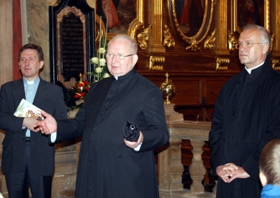Ksiądz bp Kazimierz Ryczan, ordynariusz diecezji kieleckiej, wita uczestników wycieczki w miejscowej katedrze -