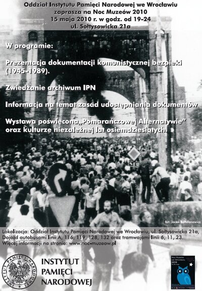 - Czytelnia Akt Jawnych w budynku A Oddziału IPN we Wrocławiu - 6. W ramach prezentacji dotyczącej działalności „Pomarańczowej Alternatywy” przed budynkiem B udostępnione zostały ścinki pomarańczowego materiału oraz kserokopie instrukcji omawiających sposób sporządzenia charakterystycznych czapeczek, które były używane podczas happeningów „Pomarańczowej Alternatywy”.