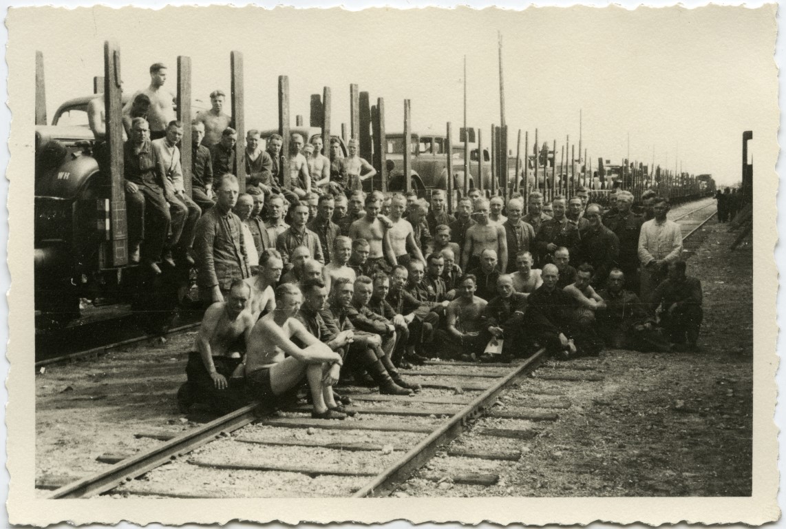 Żołnierze niemieccy zebrani przy taborze kolejowym, lipiec 1941 r. -