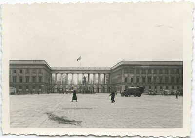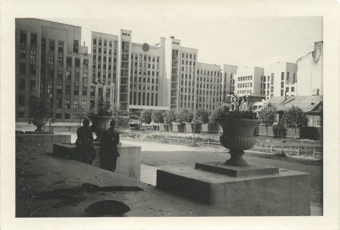 Żołnierze niemieccy przed gmachem Rady Najwyższej Białoruskiej SRR w Mińsku, wrzesień 1941 r. -