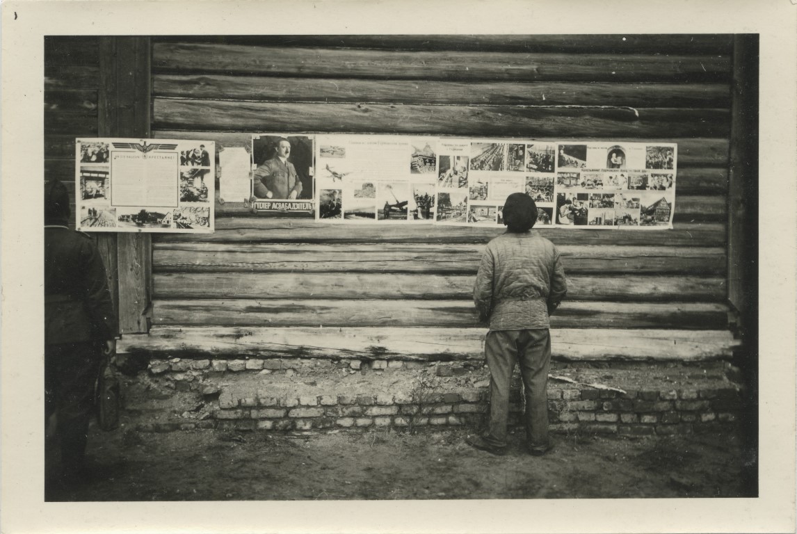 Plakaty propagandowe w języku białoruskim zawieszone na jednym z zabudowań, wrzesień 1941 r. -