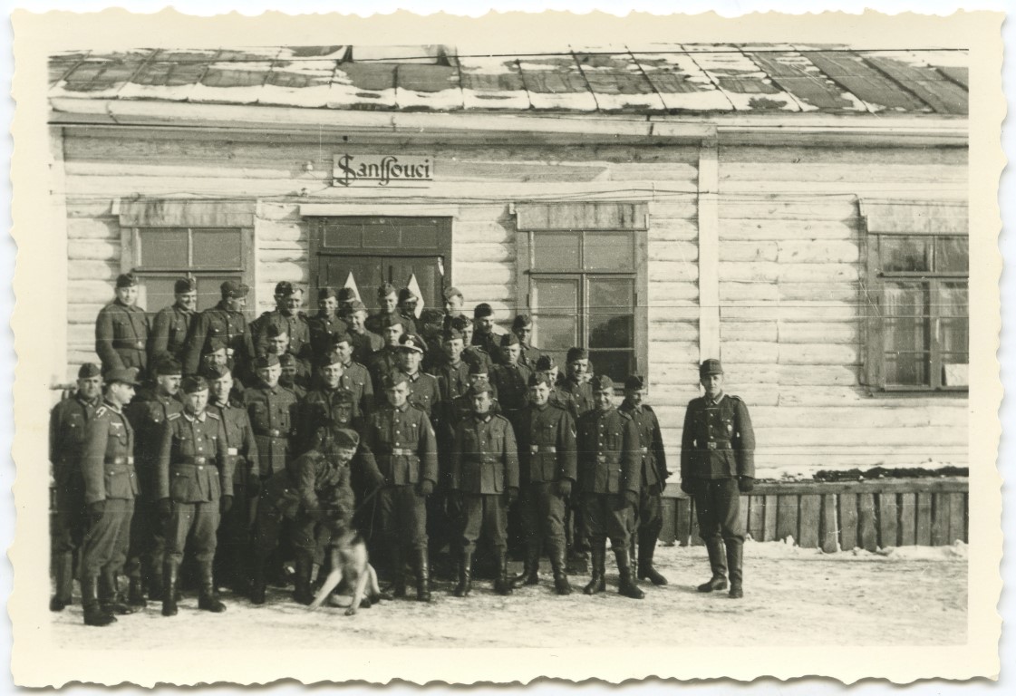Żołnierze niemieccy przed jednym z baraków w miejscowości Schnakendorf koło Gniezdowa, 1942 r. lub 1943 r. (nad wejściem ironiczny napis Sanssoucci odnoszący się do pałacu w Poczdamie) -