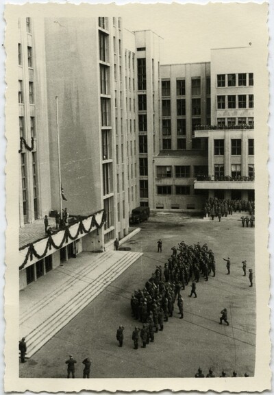 Żołnierze niemieccy przed gmachem Rady Najwyższej Białoruskiej SRR w Mińsku, lipiec 1941 r. -