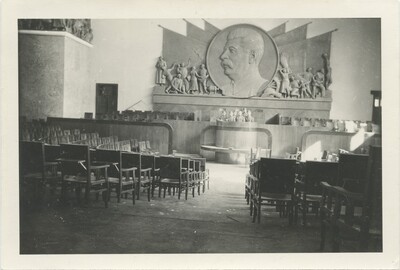 Żołnierze niemieccy w Sali obrad Rady Najwyższej Białoruskiej SRR w Mińsku, wrzesień 1941 r. -