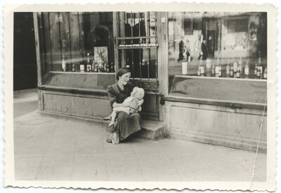Kobieta z dzieckiem przed wejściem do sklepu w Warszawie, 1942 r.