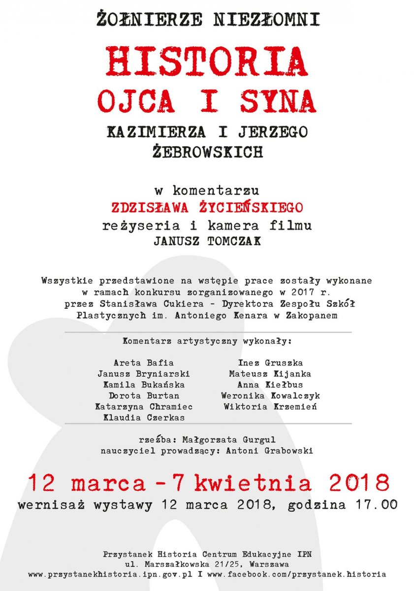 Zapraszamy do Centrum Edukacyjnego IPN Przystanek Historia na wystawę „Historia ojca i syna”, poświęconą Kazimierzowi i Jerzemu Żebrowskim, Żołnierzom Wyklętym, którzy zginęli w 1949 r. w obławie UB. Prezentowane na wystawie prace zostały wykonane przez uczniów Zespołu Szkół Plastycznych im. Antoniego Kenara w Zakopanem – są to wypowiedzi artystyczne uczniów na temat tragicznej historii Żebrowskich.