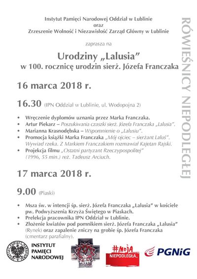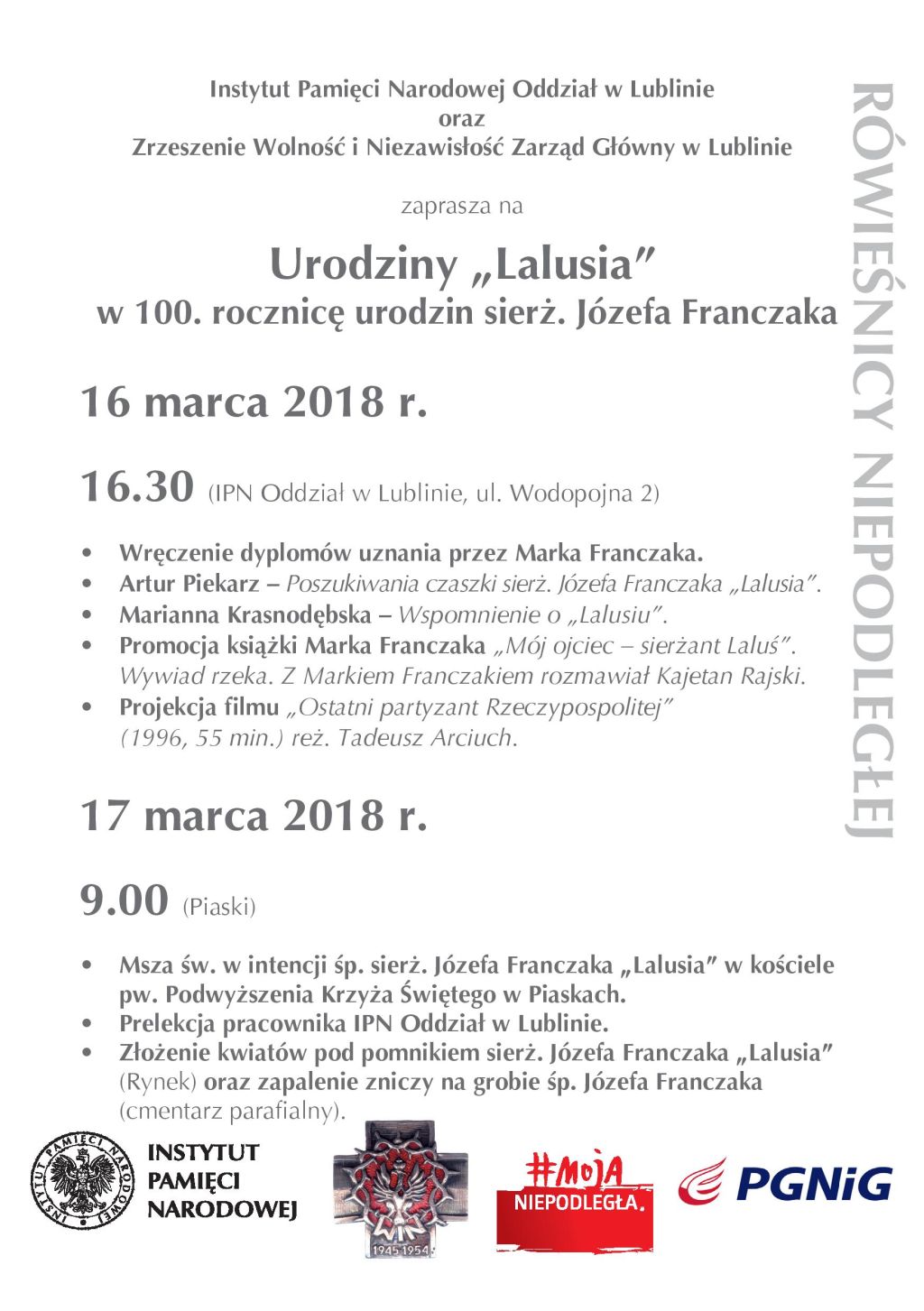 „Urodziny Lalusia” – 100. rocznica urodzin sierż. Józefa Franczaka ps. „Laluś” – to wydarzenie, które na cześć ostatniego Żołnierza Wyklętego zorganizował w Lublinie i Piaskach Instytut Pamięci Narodowej Oddział w Lublinie wraz ze Stowarzyszeniem Społeczno-Kombatanckim Zrzeszenia „Wolność i Niezawisłość”. Spotkania, które miały miejsce w piątek i sobotę, wpisały się w projekt „Rówieśnicy Niepodległej”.