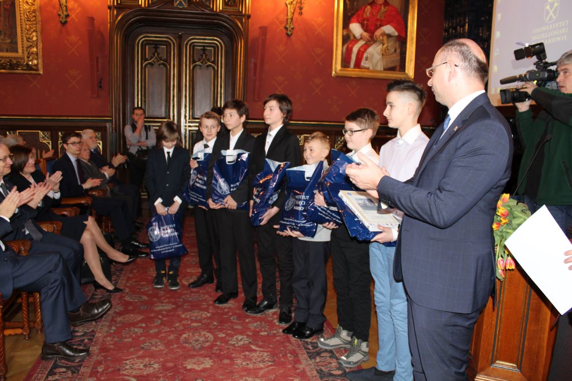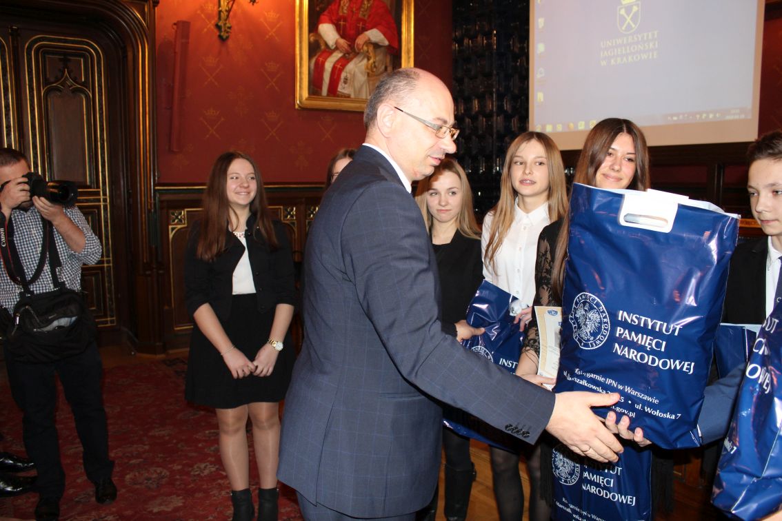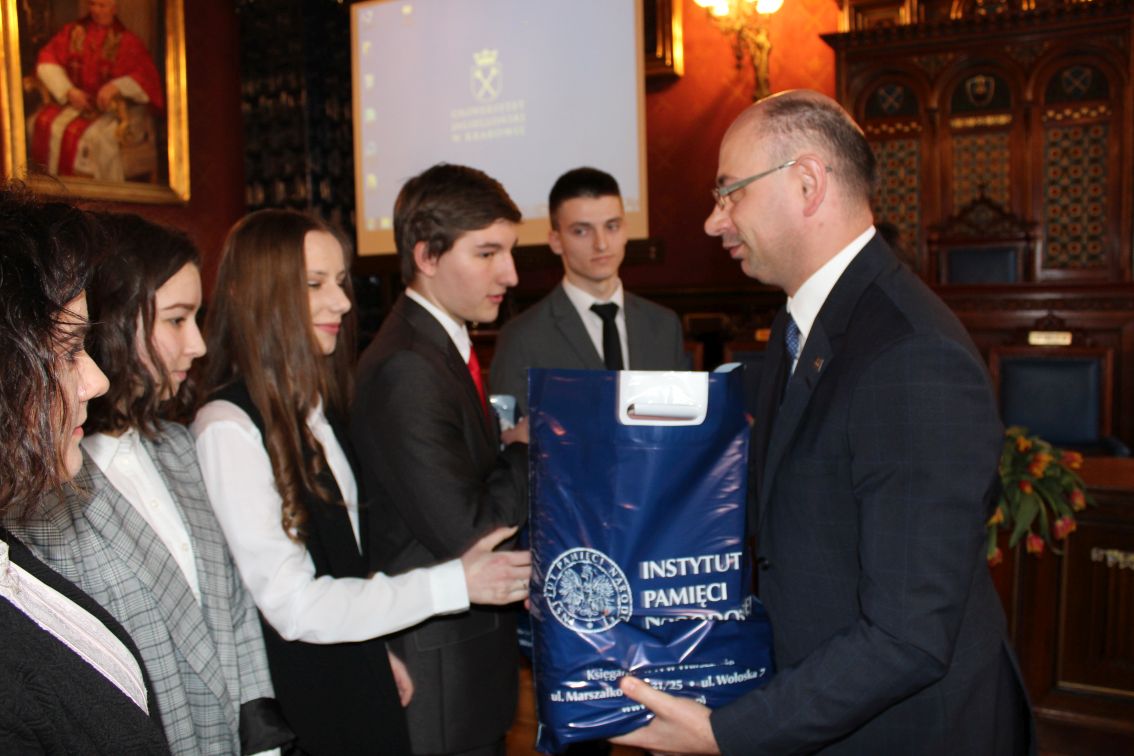 Zastępca prezesa IPN dr. Mateusz Szpytma wręczył nagrody zwycięzcom edukacyjnej gry miejskiej „Zakazana szkoła”, którą 15 marca zorganizował dla uczniów szkół podstawowych i średnich Oddział IPN w Krakowie. Zajęcia odbyły się na ulicach i w budynkach w centrum Krakowa, a ich celem było przybliżenie współczesnej młodzieży realiów życia podczas niemieckiej okupacji i historii tajnego nauczania, prowadzonego przez wykładowców akademickich UJ.