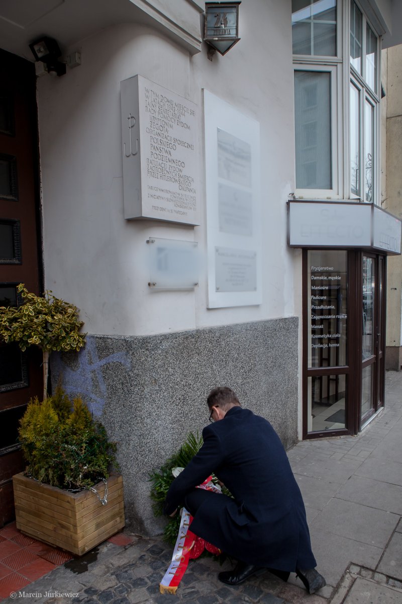 Prezes IPN złożył również kwiaty pod tablicą upamiętniającą „Żegotę”, która działała w budynku przy ul. Żurawiej w Warszawie.