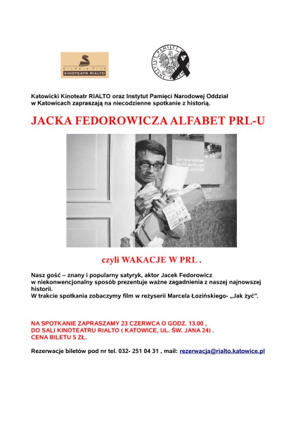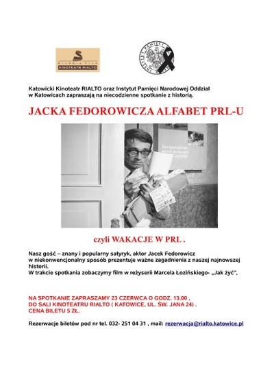 Oddział Instytutu Pamięci Narodowej w Katowicach oraz katowicki Kinoteatr Rialto zorganizowały niecodzienne spotkanie z historią: „Jacka Fedorowicza Alfabet PRL-u, czyli wakacje w PRL”, Spotkanie odbyło się 23 czerwca br. w Kinoteatrze Rialto (ul. Św. Jana 24). Nasz gość – znany i popularny satyryk, aktor Jacek Fedorowicz w niekonwencjonalny sposób zaprezentował ważne zagadnienia z naszej najnowszej historii. W trakcie spotkania wyświetlono film w reżyserii Marcela Łozińskiego – „Jak żyć”.