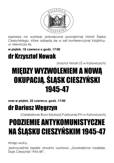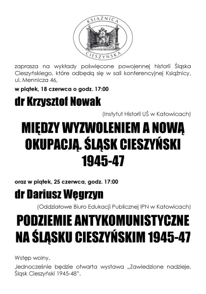 25 czerwca 2010 r. o godz. 17.00 w sali konferencyjnej Książnicy przy ul. Menniczej 46 w Cieszynie dr Dariusz Węgrzyn wygłosił wykład „Podziemie antykomunistyczne na Śląsku Cieszyńskim 1945–47”. Wykładowi towarzyszyła wystawa „Zawiedzione nadzieje. Śląsk Cieszyński 1945-48”.