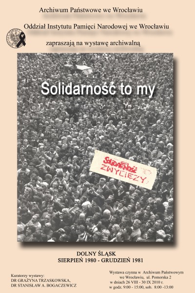 W dniu 26 sierpnia br. w Archiwum Państwowym we Wrocławiu miał miejsce wernisaż wystawy „Solidarność to my. Dolny Śląsk VIII 1980 – XII 1981”. Wystawa „Solidarność to my” dokumentuje dzieje NSZZ „Solidarność” w Polsce i na Dolnym Śląsku od okresu strajków sierpniowych do momentu wprowadzenia stanu wojennego. Wystawa powstała dzięki współpracy historyków Archiwum Państwowego oraz Oddziałowego Biura Edukacji Publicznej IPN we Wrocławiu. Jej kuratorami są dr Grażyna Trzaskowska (Archiwum Państwowe) i dr Stanisław A. Bogaczewicz (IPN).