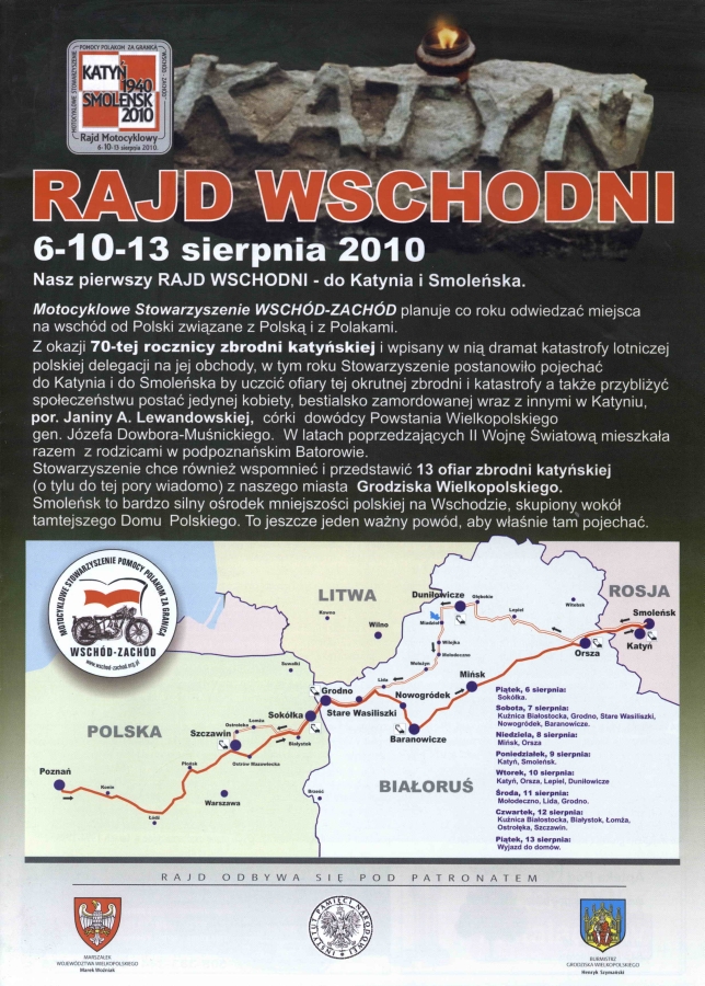 Motocyklowe Stowarzyszenie Pomocy Polakom za Granicą WSCHÓD – ZACHÓD co roku odwiedza miejsca związane z Polską i z Polakami. I tak, w piątek 6 sierpnia 2010 roku pod Pomnikiem Ofiar Katynia i Sybiru w Poznaniu Stowarzyszenie uroczyście zainauguruje Rajd Wschodni do Katynia i Smoleńska.