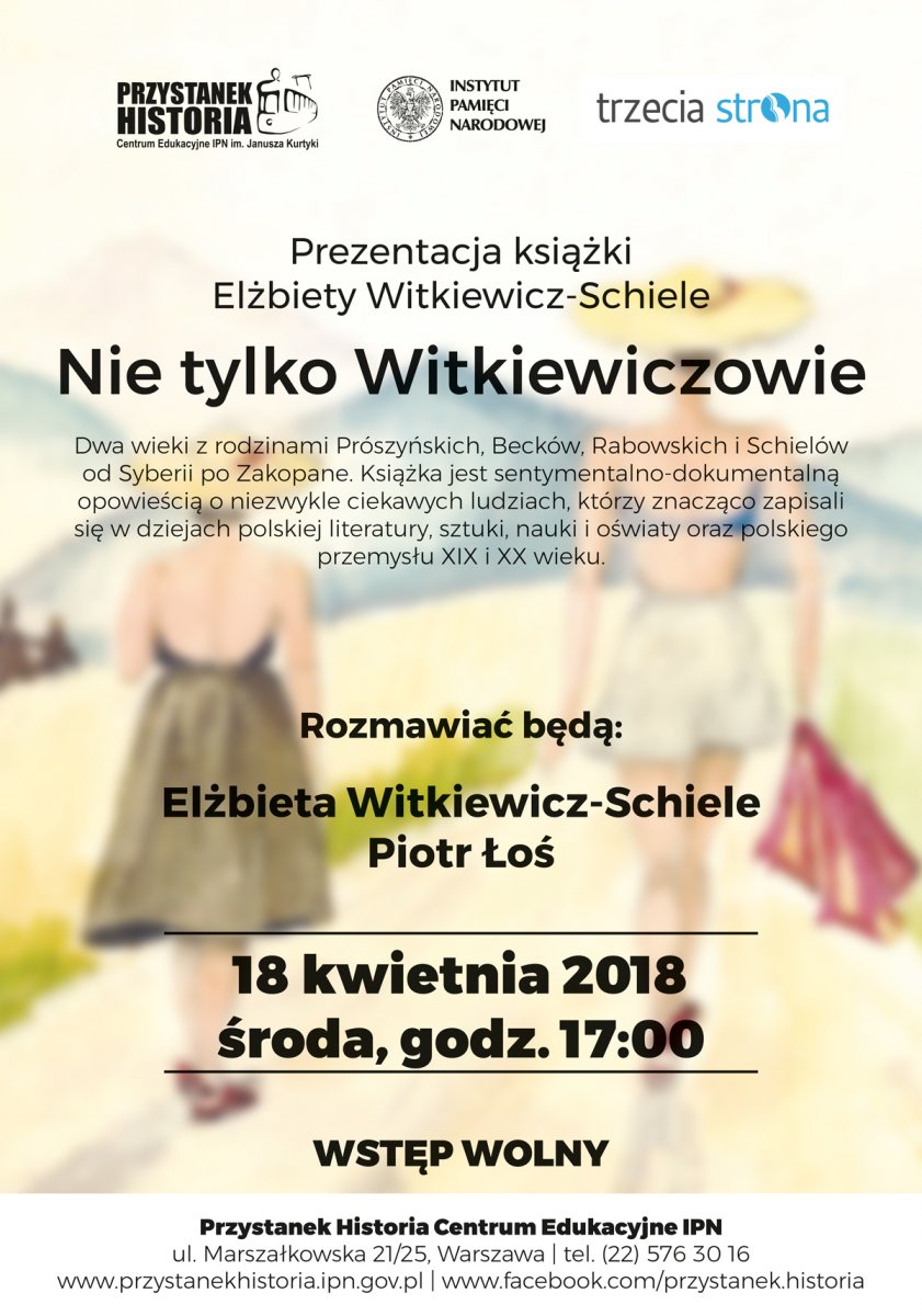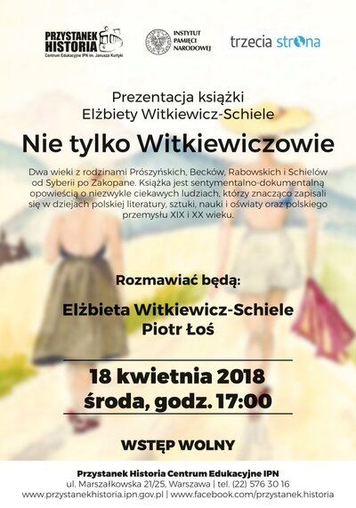 W środę 18 kwietnia, o godz. 17.00, Przystanek Historia zaprasza na prezentację książki Elżbiety Witkiewicz-Schiele Nie tylko Witkiewiczowie. Dwa wieki z rodzinami Prószyńskich, Becków, Rabowskich i Schielów od Syberii po Zakopane. Rozmowę z autorką poprowadzi dziennikarz Piotr Łoś.
