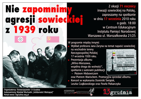Zapraszamy do Centrum Edukacyjnego IPN Przystanek Historia w Warszawie, godz. 18.00: w programie – wykład prof. Jana Żaryna, prezentacja albumu „Wilno-Warszawa, wspólna droga do wolności”, koncert Dominiki Świątek, Leszka Czajkowskiego i Pawła Piekarczyka.