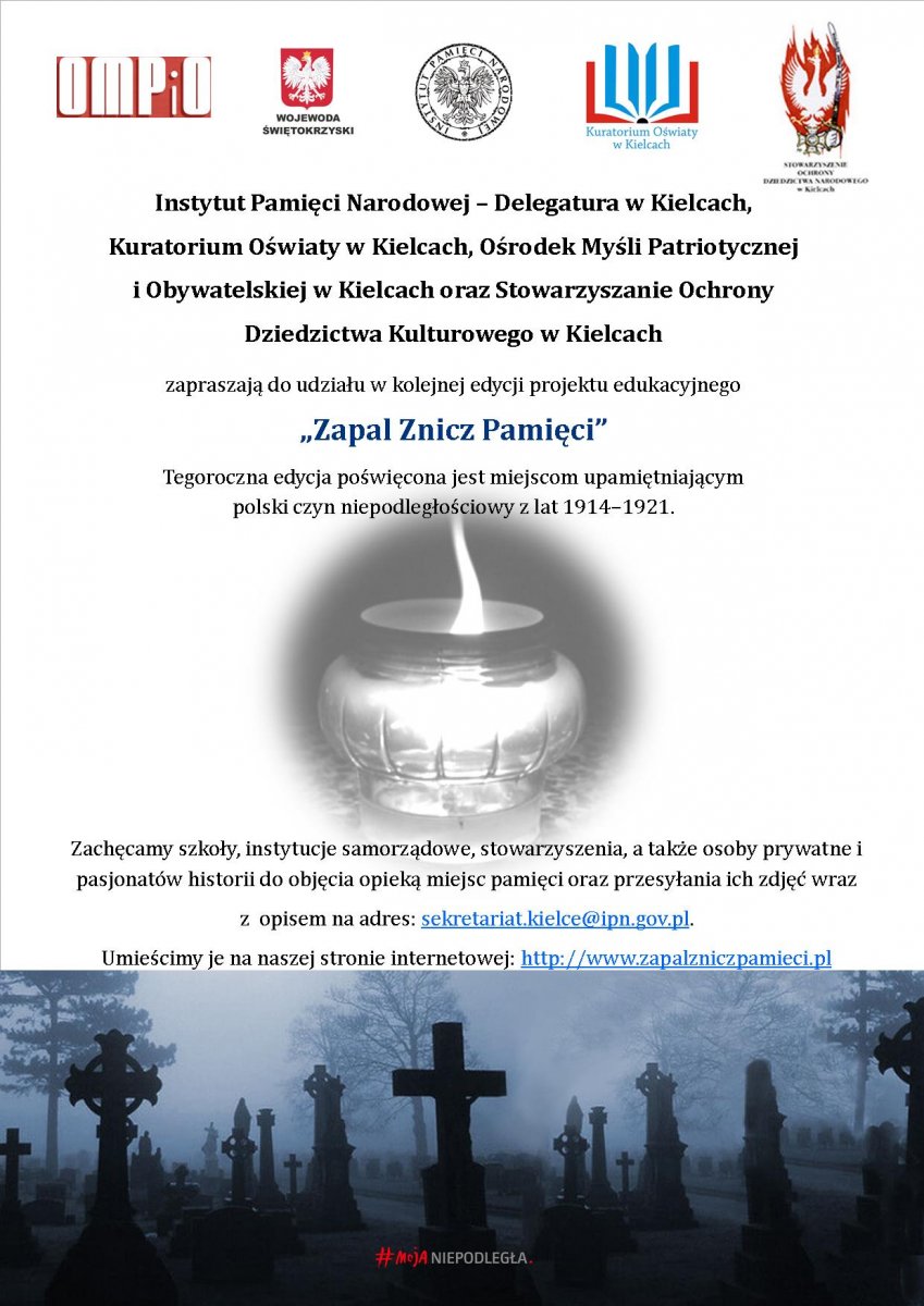 Przypadające w tym roku stulecie odrodzenia państwa polskiego jest okazją do przypomnienia wysiłków Polaków, zmierzających do odzyskania niepodległości w czasie I wojny światowej, oraz walk o granice po jej zakończeniu. Zachęcamy więc szkoły, instytucje samorządowe, stowarzyszenia, a także osoby prywatne i pasjonatów historii do wyszukania miejsc pamięci narodowej związanych z wydarzeniami dotyczącymi odrodzenia Polski, jak również z okresu wojny polsko-bolszewickiej, wzięcie ich pod opiekę, uporządkowanie, a następnie symboliczne zapalenie znicza. W ten sposób złożymy swoisty hołd osobom, które nie wahały się w okresie Wielkiej Wojny zaryzykować życia i stanąć w pierwszym szeregu bojowników o sprawę narodową. Dla uczniów stanowić będzie to znakomitą lekcję, zarówno historii w wymiarze lokalnym, jak i szacunku dla postaw patriotycznych i obywatelskich.