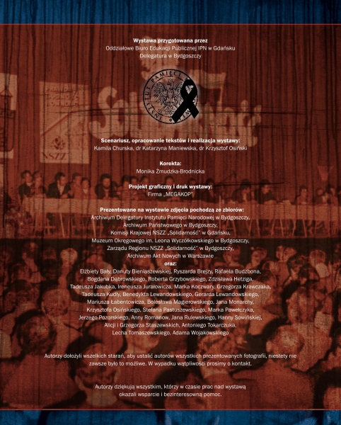 Wystawę składającą się z 23 plansz prezentujących najważniejsze wydarzenia i aspekty działania Związku (na przykład Sierpień ’80, wiec w hali Astoria, Konferencje ds. Żywności, Strajki chłopskie w regionie, Bydgoski marzec 1981 r., działalność Komitetu Obrony Więzionych za Przekonania, I Walne Zebranie Delegatów NSZZ „Solidarność”, I Krajowy Zjazd Delegatów NSZZ „Solidarność”, ponadto także Stan wojenny i jego ofiary, ostatnią mszę i pogrzeb ks. Jerzego Popiełuszki, a także wybory 1989 r.) przygotowało Biuro Edukacji Publicznej Delegatury Instytutu Pamięci Narodowej w Bydgoszczy. Zaprezentowane zdjęcia pochodzą z prywatnych kolekcji działaczy i sympatyków Związku oraz archiwów.
