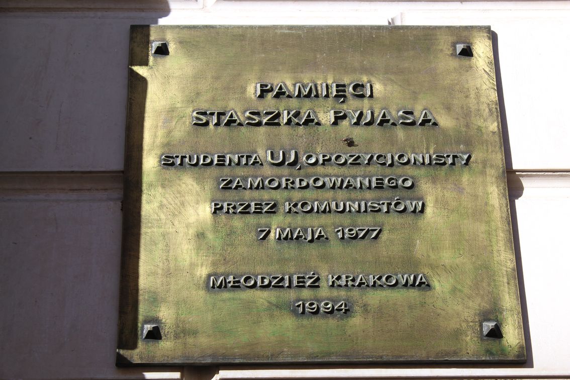 Stanisław Pyjas zmarł 7 maja 1977 r. w tajemniczych okolicznościach. Ciało studenta filologii polskiej i filozofii na Uniwersytecie Jagiellońskim, działacza opozycyjnego, współpracownika Komitetu Obrony Robotników zostało znalezione rankiem w bramie kamienicy przy ul. Szewskiej 7. Według środowisk opozycyjnych śmierć studenta była skutkiem pobicia przez funkcjonariuszy Służby Bezpieczeństwa. Władze twierdziły, iż spadł ze schodów.