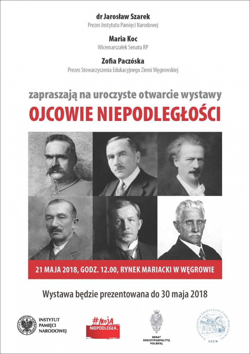 Węgrów to jedno z kilkunastu miejsc w całej Polsce, w których 21 maja pokazano ekspozycję Instytutu Pamięci Narodowej „Ojcowie Niepodległości”. Prezentuje ona liderów walki o wolną Polskę w 1918 r.: Józefa Piłsudskiego, Romana Dmowskiego, Ignacego Jana Paderewskiego, Wincentego Witosa, Wojciecha Korfantego i Ignacego Daszyńskiego. Ponad dwumetrowe plansze z sylwetkami wybitnych mężów stanu opatrzone są ich biogramami w języku polskim i angielskim. Na wystawie znajdziemy także kalendarium najistotniejszych wydarzeń w procesie odradzania się niepodległej Polski oraz kopie najważniejszych dokumentów, związanych z 11 listopada 1918 r. Korzystając ze specjalnej mapy, można prześledzić, jak w latach 1918–1921 zmieniały się granice II Rzeczypospolitej. Wystawa będzie prezentowana w Węgrowie do 30 maja 2018. Otwarcie miało szczególnie uroczysty charakter.