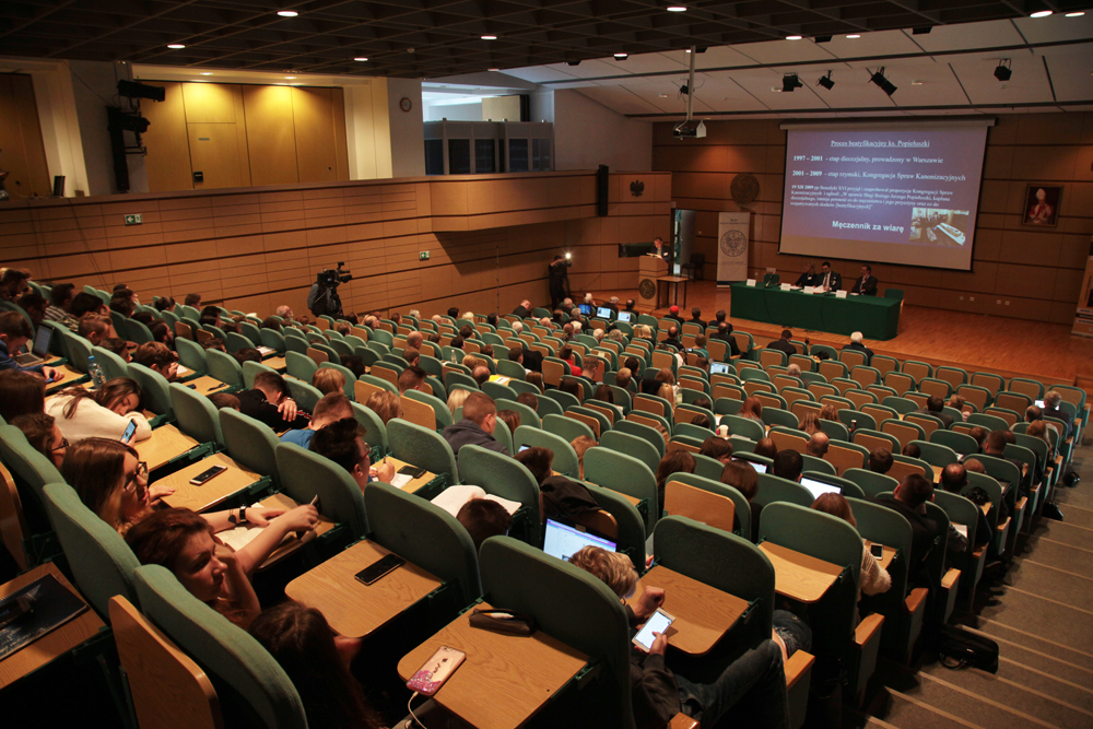 W pierwszej sesji wystąpiło trzech referentów: ks. prof. dr hab. Józef Naumowicz z UKSW, senator RP prof. dr hab. Jan Żaryn reprezentujący UKSW oraz dr Rafał Łatka z BBH IPN. Pierwszy z prelegentów omówił przebieg procesu beatyfikacyjnego ks. Popiełuszki, prowadzonego w Warszawie od 1997 do 2001 roku. Doprowadził on do uznania ks. Jerzego za męczennika. Dowiódł też, że msze za Ojczyznę stanowiły fenomen nie tylko społeczny, ale także głęboko duchowy i ściśle religijny. Profesor Żaryn zaznaczył w wystąpieniu, że w raporcie gubernatora rosyjskiego o polskich kapłanach w 1901 r. pisano: „Dla księdza katolickiego służenie ołtarzowi i sprawie narodowej […] jest symbolem nierozłącznym” – Słowa te mogłyby także pochodzić od przedstawiciela władz komunistycznych w XX wieku. Śmierć kapłanów, najczęściej męczeńska, zadawana była z nienawiści do Polski suwerennej i chrześcijańskiej. Lista męczenników – duchownych XX wieku jest długa, a kończy się na ks. Jerzym Popiełuszce – wzorze polskiego kapłana. Dr Łatka wskazywał w referacie, iż „jednym z celów władz PRL w dekadzie lat 80. było zapobieganie współpracy opozycji z duchowieństwem. Dygnitarze PZPR przy pomocy SB i Urzędu ds. Wyznań starali się izolować działaczy „Solidarności” i „kleru”. To zadanie było szczególnie istotne w stanie wojennym. Rola księży odprawiających nabożeństwa za Ojczyznę była kluczowa w podtrzymywaniu ducha oporu w społeczeństwie. Władze komunistyczne naciskały na biskupów, by zabronili głoszenia kazań ukazujących prawdziwą twarz totalitarnego systemu”.