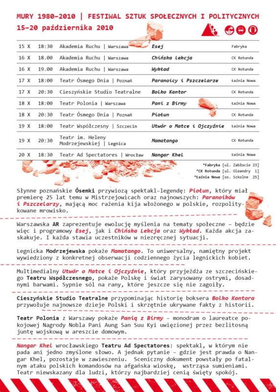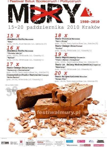 W dniach 15–20 października trwa w Krakowie I Festiwal Sztuk Społecznych i Politycznych „Mury 1980–2010”. IPN jest jednym ze współorganizatorów festiwalu.