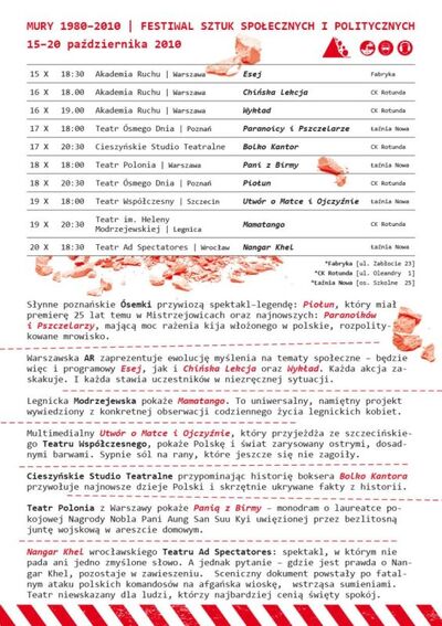 Bohaterowie Murów, którzy od kilku dziesięciu lat są znakami firmowymi polskiego teatru niezależnego, to poznański Teatr Ósmego Dnia i Akademia Ruchu z Warszawy. Ósemki przywożą spektakl – legendę – „Piołun”, który miał premierę 25 lat temu w Mistrzejowicach i grany był wtedy również u krakowskich dominikanów oraz swoją najnowszą premierę „Paranoików i pszczelarzy”, mającą moc rażenia kija włożonego w polskie, rozpolitykowane mrowisko. Akademia Ruchu także da świadectwo swojej niezwykłej żywotności – zarówno prezentując akcje, które zawsze wpisują się w miejsce i w społeczność, wśród której są podejmowane, jak i dając historyczną „prelekcję” – „Esej III”, w którym pokaże kilkudziesięcioletnią ewolucję swojego myślenia na tematy społeczne i na temat formy to myślenie wyrażającej.