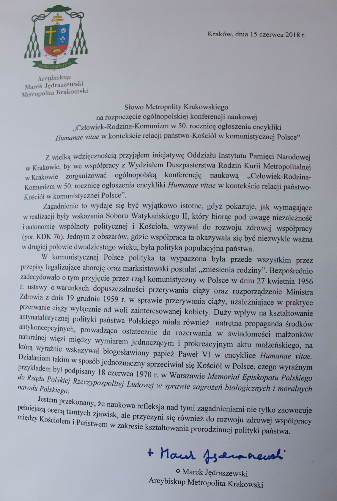 „Zagadnienie [będące przedmiotem konferencji] wydaje się być wyjątkowo istotne, gdyż pokazuje, jak wymagające w realizacji były wskazania Soboru Watykańskiego II, który w Polsce – biorąc pod uwagę niezależność wspólnoty politycznej i Kościoła – wzywał do rozsądku i zdrowej współpracy” – napisał abp Jędraszewski. „Jednym z obszarów, gdzie ta współpraca okazywała się szczególnie ważna w drugiej połowie XX wieku była polityka populacyjna państwa. W komunistycznej Polsce polityka ta była wypaczona przede wszystkim przez przepisy legalizujące aborcję oraz marksistowski postulat zniesienia rodziny. […] Jestem przekonany, że naukowa refleksja nad tymi zagadnieniami nie tylko zaowocuje pełniejszą oceną tamtych zjawisk, ale również przyczyni się do rozwoju zdrowej współpracy między Kościołem i państwem w zakresie kształtowania polityki prorodzinnej”.
