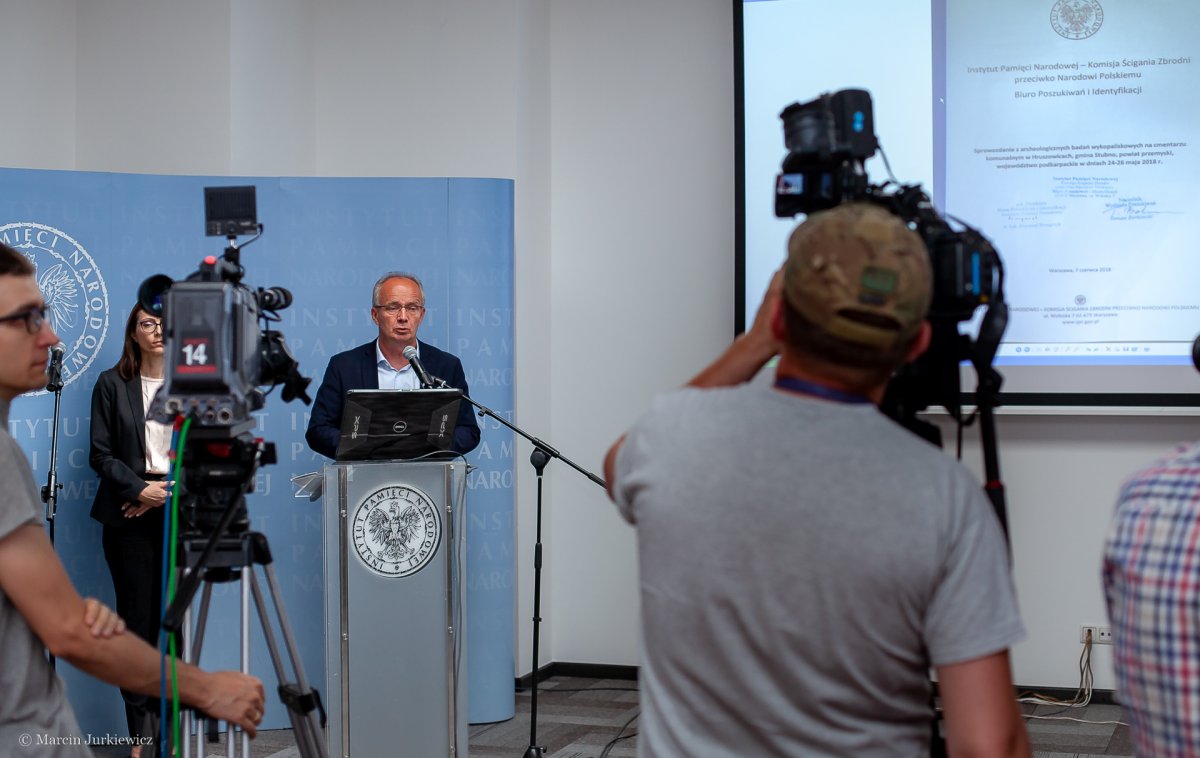 – Nie znajdujemy w oparciu o wyniki przeprowadzonych działań w Hruszowicach żadnych naukowych podstaw do tego, żeby twierdzić, że w miejscu gdzie przeprowadziliśmy prace, były masowe albo też pojedyncze groby członków UPA - poinformował wiceprezes IPN Krzysztof Szwagrzyk, przedstawiając wyniki prac archeologicznych Biura Poszukiwań i Identyfikacji IPN, przeprowadzonych w dniach 24-26 maja 2018 r. na cmentarzu w Hruszowicach.