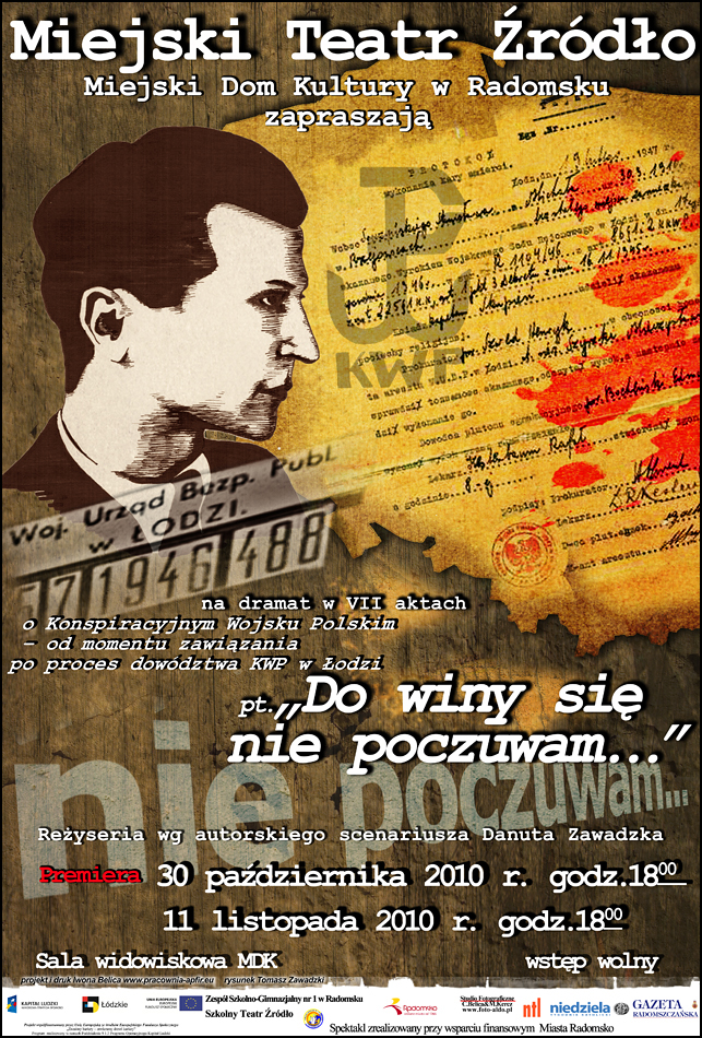 30 października br. w sali widowiskowej Miejskiego Domu Kultury w Radomsku (ul. Brzeźnicka 5) miała miejsce premiera dramatu w VII aktach o Konspiracyjnym Wojsku Polskim – od momentu zawiązania po proces dowództwa KWP w Łodzi pt. „Do winy się nie przyznam...” Spektakl według własnego scenariusza wyreżyserowała Danuta Zawadzka. Przedsięwzięcie przygotowały Miejski Teatr Źródło oraz Miejski Dom Kultury w Radomsku przy wsparciu Miasta Radomsko. W opracowaniu scenariusza oparto się m.in. na materiałach z Oddziału Instytutu Pamięci Narodowej z Łodzi. Spektakl został wystawiony w tym samym miejscu również 11 listopada br.