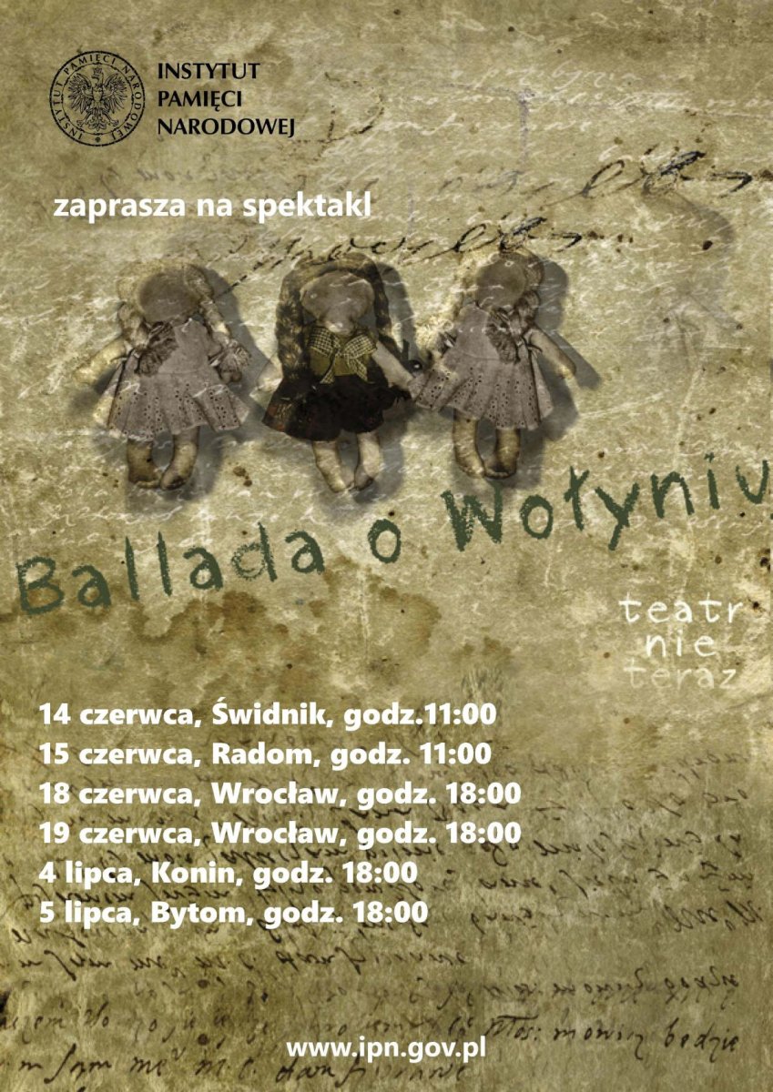 „Ballada o Wołyniu” to pierwszy w Polsce spektakl sceniczny, który opowiada o ludobójstwie na polskiej ludności Kresów Wschodnich w latach II wojny św., dokonanym przez nacjonalistów ukraińskich. Ten niezwykle trudny temat, przez cale dziesięciolecia przemilczany, a obecnie niestety nadal zakłamywany, obchodzi jednak setki tysięcy Polaków: wciąż żyjących świadków tamtych wydarzeń, ich rodziny i ludzi zainteresowanych prawdą historyczną. Scenariusz spektaklu korzysta z wątków legendarnej książki wielkiego polskiego pisarza Włodzimierza Odojewskiego „Zasypie wszystko, zawieje” (za zgodą autora). Wykorzystywane są także oryginalne świadectwa osób, które przeżyły Zagładę Polaków na Kresach oraz stare pieśni, w tym starą melodię ukraińską ze współczesnymi słowami Bogny Lewtak-Baczyńskiej.
