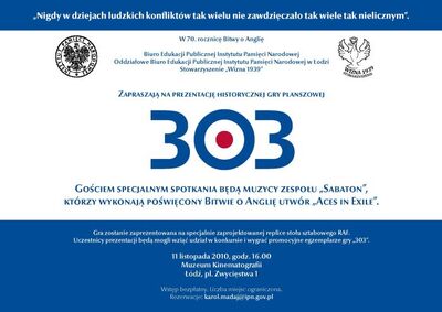 W dniu Narodowego Święta Niepodległości w Muzeum Kinematografii w Łodzi zaprezentowano historyczną grę planszową „303” poświęconą lotnikom legendarnego Dywizjonu Myśliwskiego. Prezentacji towarzyszyła ekspozycja wystawy „Battle of Britain”.