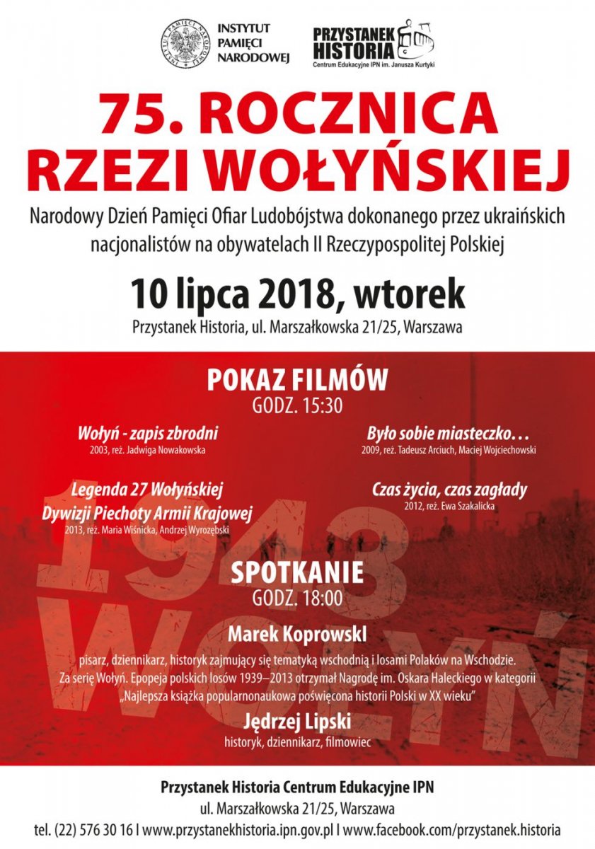 We wtorek, 10 lipca 2018 r., w ramach obchodów 75. rocznicy Zbrodni Wołyńskiej, w Przystanku Historia– Centrum Edukacyjnym IPN im. Janusza Kurtyki (ul. Marszałkowska 21/25) odbył się pokaz filmów dokumentalnych i spotkanie z dziennikarzem Markiem Koprowskim. Spotkanie poprowadził dr Jędrzej Lipski.