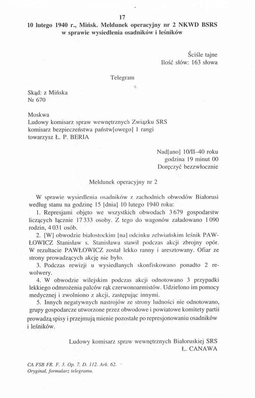Obecnie prezentujemy drugie z powyższych dzieł – „Deportacje obywateli polskich z Zachodniej Ukrainy i Zachodniej Białorusi w 1940 roku”. Książka, która zawiera 170 dokumentów z Archiwum Głównego FSB i 2 dokumenty z Archiwum Prezydenta FR stawia w konkretnym, udokumentowanym wymiarze rezultaty deportacji dokonanych w 1940 roku.