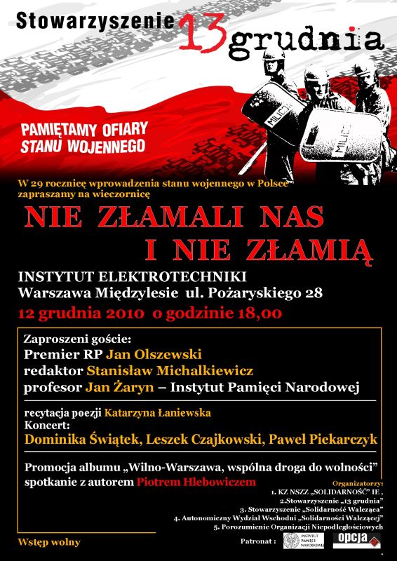 Stowarzyszenie „13 grudnia” w 29. rocznicę wprowadzenia w Polsce stanu wojennego zorganizowało wieczornicę zatytułowaną „Nie złamali nas i nie złamią”, która odbyła się 12 grudnia 2010 r. w Instytucie Elektrotechniki w Warszawie Międzylesiu, ul. Pożaryskiego 28.