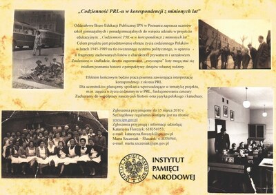 W dniu 22 czerwca 2010 r. o godz. 12.00, w siedzibie poznańskiego oddziału Instytutu Pamięci Narodowej, przy ul. Rolnej 45a, odbyło się uroczyste podsumowanie zainicjowanego w marcu 2010 roku projektu edukacyjnego dla szkół gimnazjalnych i ponadgimnazjalnych województwa wielkopolskiego i lubuskiego – „Codzienność PRL w korespondencji z minionych lat”.