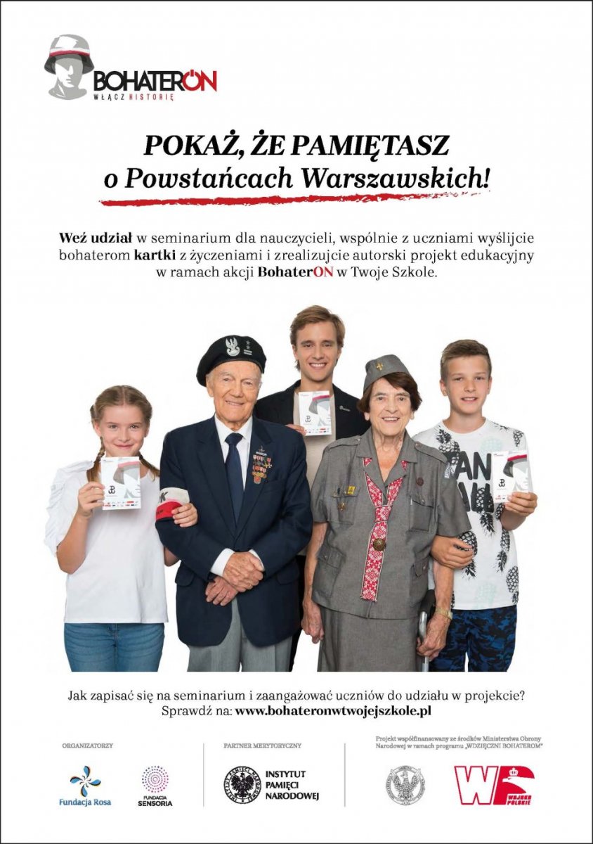 Instytut Pamięci Narodowej oraz Fundacja Rosa i Fundacja Sensoria – organizatorzy ogólnopolskiej kampanii „BohaterON – włącz historię!” – zapraszają nauczycieli historii i edukatorów pracujących z młodzieżą w wieku 16—19 lat do udziału w bezpłatnym seminarium skupiającym się wokół nowoczesnego i aktywnego nauczania o historii Polskiego Państwa Podziemnego i Powstania Warszawskiego.