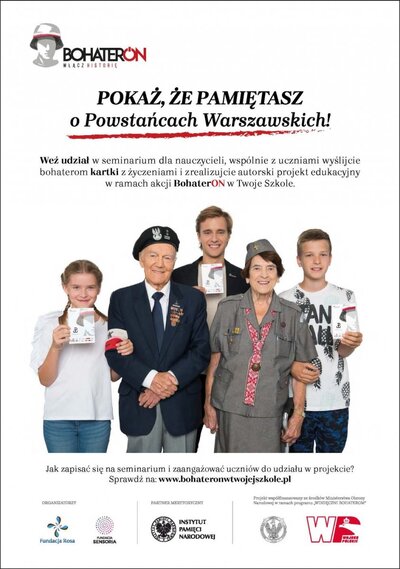 Nauczycieli szkół podstawowych, którzy chcieliby dołączyć do akcji wypisywania kartek do Powstańców Warszawskich, również zapraszamy do odwiedzenia strony www.bohateronwtwojejszkole.pl. Podstawą do otrzymania pakietu materiałów edukacyjnych (konspekt zajęć dot. Powstania Warszawskiego i edukacji patriotycznej, pocztówki BohaterON, plakat informacyjny), a po akcji – pamiątkowego dyplomu, będzie poprawnie wypełniony formularz zgłoszeniowy.