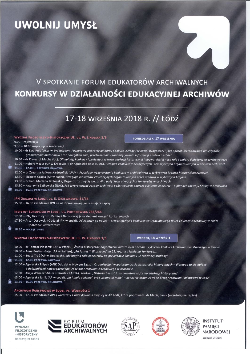 W dniach 17–18 września 2018 r. odbyło się w Łodzi V spotkanie Forum Edukatorów Archiwalnych pt. „Konkursy w działalności edukacyjnej archiwów”. Oddział IPN w Łodzi był jednym ze współorganizatorów spotkania, którego uczestnicy mogli zwiedzić Oddziałowe Archiwum przy ul. Orzeszkowej, uczestniczyć w wykładzie Artura Ossowskiego, naczelnika Oddziałowego Biura Edukacji Narodowej, zatytułowanym Gry Instytutu Pamięci Narodowej jako element zmagań konkursowych oraz warsztatach: „Od zabawy po naukę – przedsięwzięcia konkursowe Oddziałowego Biura Edukacji Narodowej IPN w Łodzi”