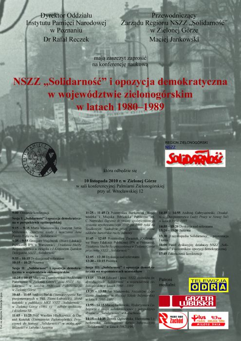 W ramach obchodów XXX-lecia narodzin „Solidarności” poznański oddział Instytutu Pamięci Narodowej oraz Zarząd NSZZ „Solidarność” Region Zielonogórski zorganizowały konferencję naukową pt. „NSZZ „Solidarność” i opozycja demokratyczna w województwie zielonogórskim w latach 1980-1989”, która odbyła się 10 listopada 2010 r. w Sali Konferencyjnej Palmiarni Zielonogórskiej przy ul. Wrocławskiej 12 w Zielonej Górze.