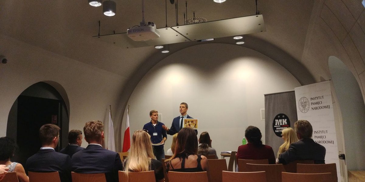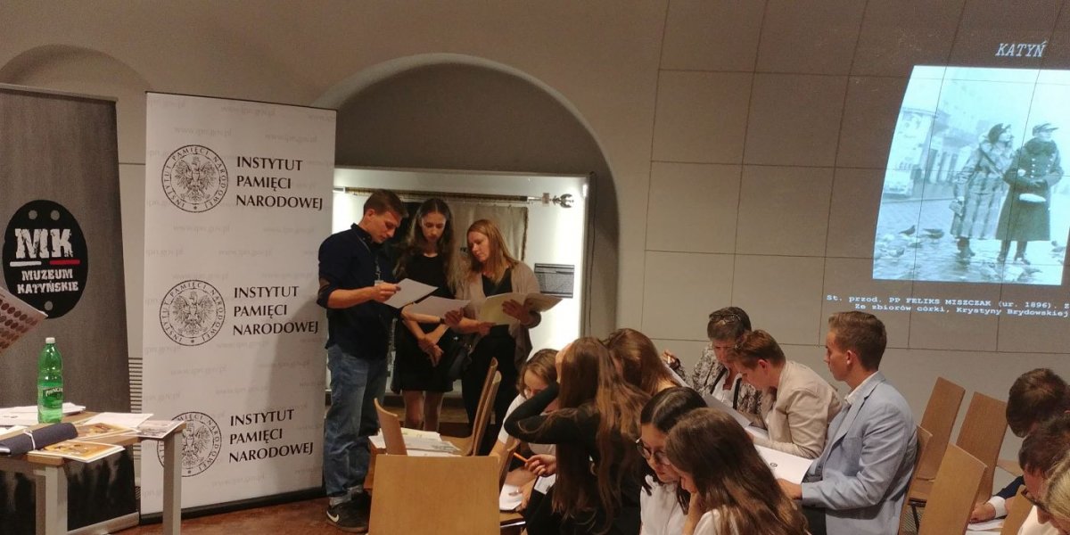 Po uroczystym wręczeniu dyplomów młodzież wzięła udział w warsztatach edukacyjnych „Śledztwo katyńskie”, przygotowanych i poprowadzonych przez Karola Madaja i Kacpra Ciesielskiego.