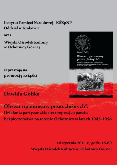Instytut Pamięci Narodowej Oddział w Krakowie oraz Wiejski Ośrodek Kultury w Ochotnicy Górnej zorganizowały promocję książki Dawida Golika pt. „Obszar opanowany przez »leśnych«. Działania partyzanckie oraz represje aparatu bezpieczeństwa na terenie Ochotnicy w latach 1945–1956”. Promocja odbyła się w Wiejskim Ośrodku Kultury w Ochotnicy Górnej dnia 16 stycznia 2011 r.