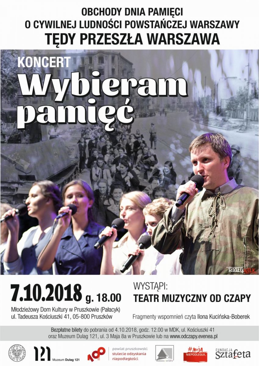 Biuro Edukacji Narodowej IPN zaprasza na koncert piosenek z Powstania Warszawskiego w wykonaniu Teatru Muzycznego „Od Czapy” pod tytułem „Wybieram pamięć”, będący zwieńczeniem obchodów Dnia Pamięci o Cywilnej Ludności Powstańczej Warszawy w ramach projektu „Tędy przeszła Warszawa”.