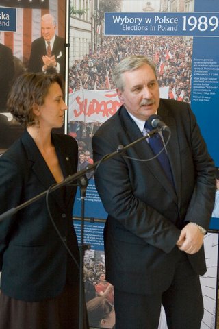 Prof. Jerzy Eisler i Joanna Rohozińska-Michalska z National Endowment for Democracy (NED) podczas otwarcia wystawy w Woodrow Wilson Center w Waszyngtonie, 3 grudnia 2009 r. Fot. Paweł Sasanka -