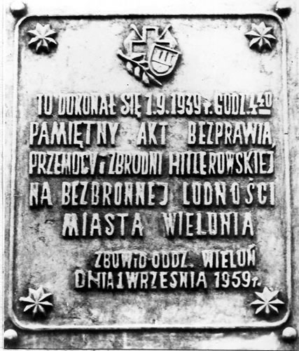 Tablica pamiątkowa wmurowana na gmach studium wychowania przedszkolnego w Wieluniu, gdzie w dniu 1 września 1939 roku znajdował się Szpital Wszystkich Świętych |