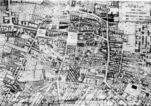 Plan miasta Wielunia ilustrujący zniszczenia wojenne miasta we wrześniu 1939 roku uwzględniający położenie Szpitala Wszystkich Świętych |